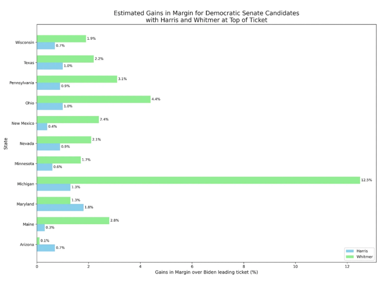 Their conclusion: While Senate candidates remained in strong shape overall in relation to Biden, with an average 55-45 lead over their opponents, their lead expanded modestly with Harris atop the ticket (56-44) and slightly more with Whitmer (57-43).