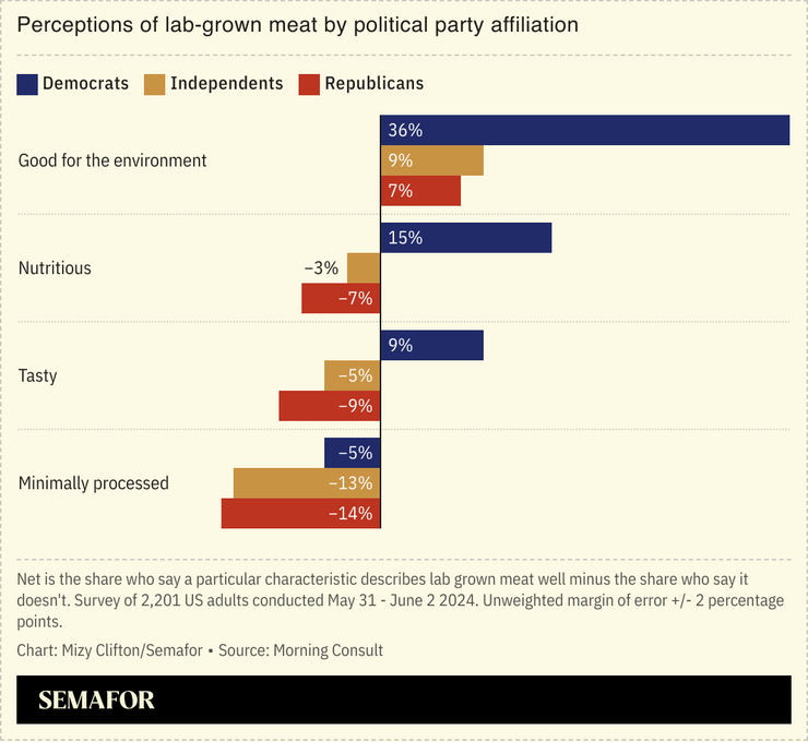 The US is one of the few countries that have approved lab-grown meat for human consumption, but a “culture war” may be brewing, The Economist noted: Florida’s governor Ron DeSantis banned its sale in the state in May, citing a conspiracy that global elites want to “push a diet of petri-dish meat” and that it was anti-American. Lawmakers in other countries have echoed similar ideas about lab-grown meat as an assault on national identity: An Italian lawmaker told Politico in 2023 that banning lab-grown meat was important to “defending work, environment, culture, and identity.” This messaging may shape public perceptions along partisan lines: Democrats are more likely than Republicans to have a net-positive opinion on cultivated meat, food and climate outlet Green Queen reported.