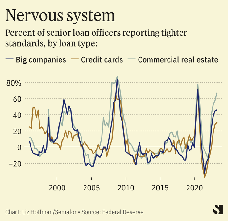 And even if you look to banks as bellwethers, forward-looking metrics are worse than the latest earnings suggest. Standards for new loans are getting tighter at a rate not seen, except for the early days of the pandemic, since 2008.