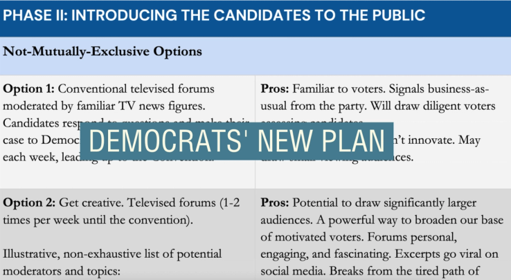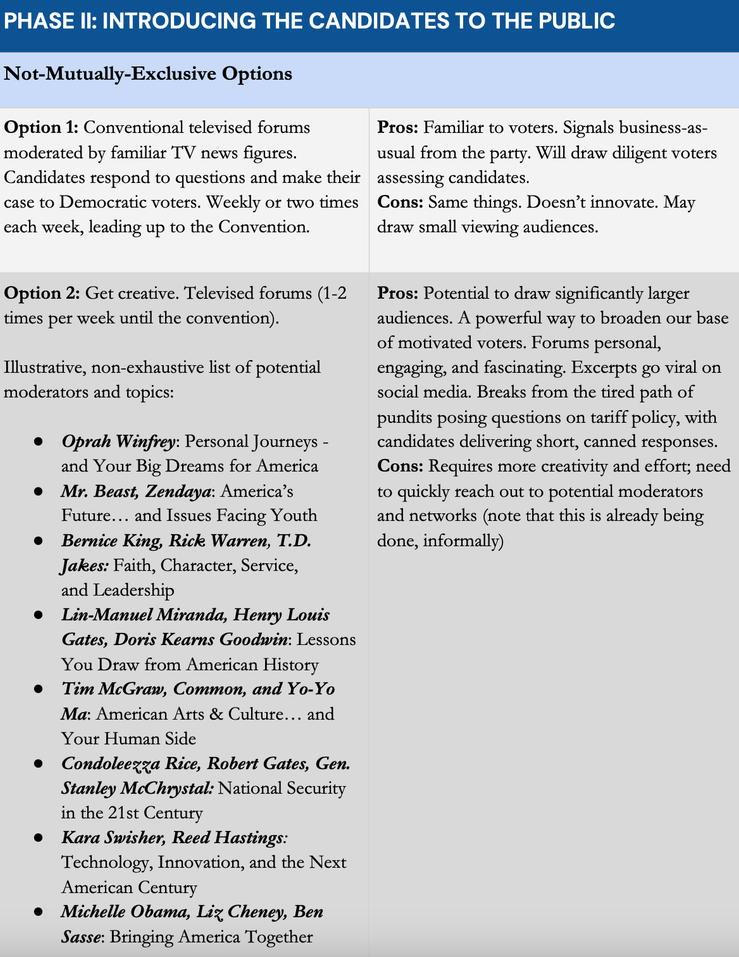 The candidates could then introduce themselves either in traditional televised forums or — as the authors prefer — in a televised series that includes Oprah Winfrey moderating a forum on “Personal Journeys – and Your Big Dreams for America”; Mr. Beast and Zendaya moderating one on “America’s Future…And Issues Facing Youth”; and Kara Swisher and Reed Hastings hosting one on “Technology, Innovation, and the Next American Century.” The memo says that informal outreach has begun to moderators and television networks.