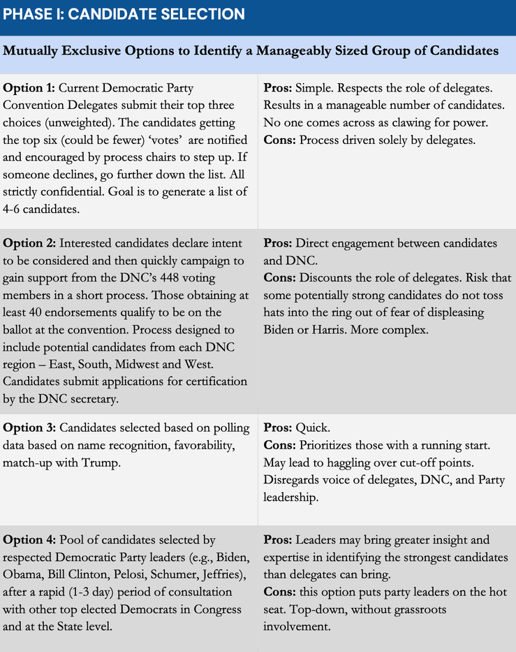 The memo, which draws on ideas circulating widely among Democrats, breaks the process of replacing Biden at next month’s Democratic National Convention into three steps: Phase I is the candidate selection; Phase II details how to introduce candidates to the public; Phase III war games the presidential nominee selection process.