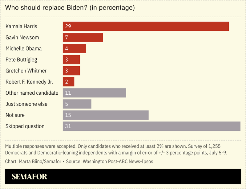 Harris is a bigger proponent of action on the environment than Biden, Bloomberg noted: She proposed a $10 trillion climate deal and backed the Green New Deal when she ran as a candidate in 2020, and vowed to ban fracking. She has also become a key voice in the abortion rights movement — a strong voter issue for the Democrats nationally. After the 2020 murder of George Floyd, she also introduced laws to ban police chokeholds and no-knock warrants, reform qualified immunity, and establish a national standard for use of force. But as an attorney general, she also supported California’s death penalty, which drew criticism from progressives, Semafor’s Morgan Chalfant noted. She’s also been a vocal supporter of student debt relief.
