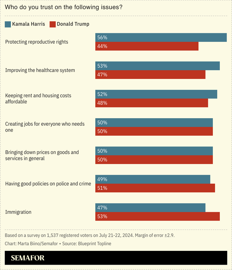The polling, shared first with Semafor, found Harris starting the general election with some big strengths on social issues. Asked what issue they associated with Harris, 52% said “abortion and birth control,” a sign that the vice president’s years-long campaigning against the Dobbs decision had sunk in.