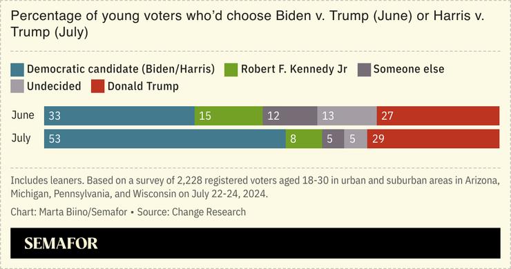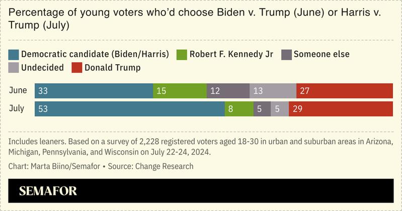 A new poll shows Vice President Kamala Harris outperforming Donald Trump in swing states among registered voters 30 years old and younger in data shared first with Semafor.