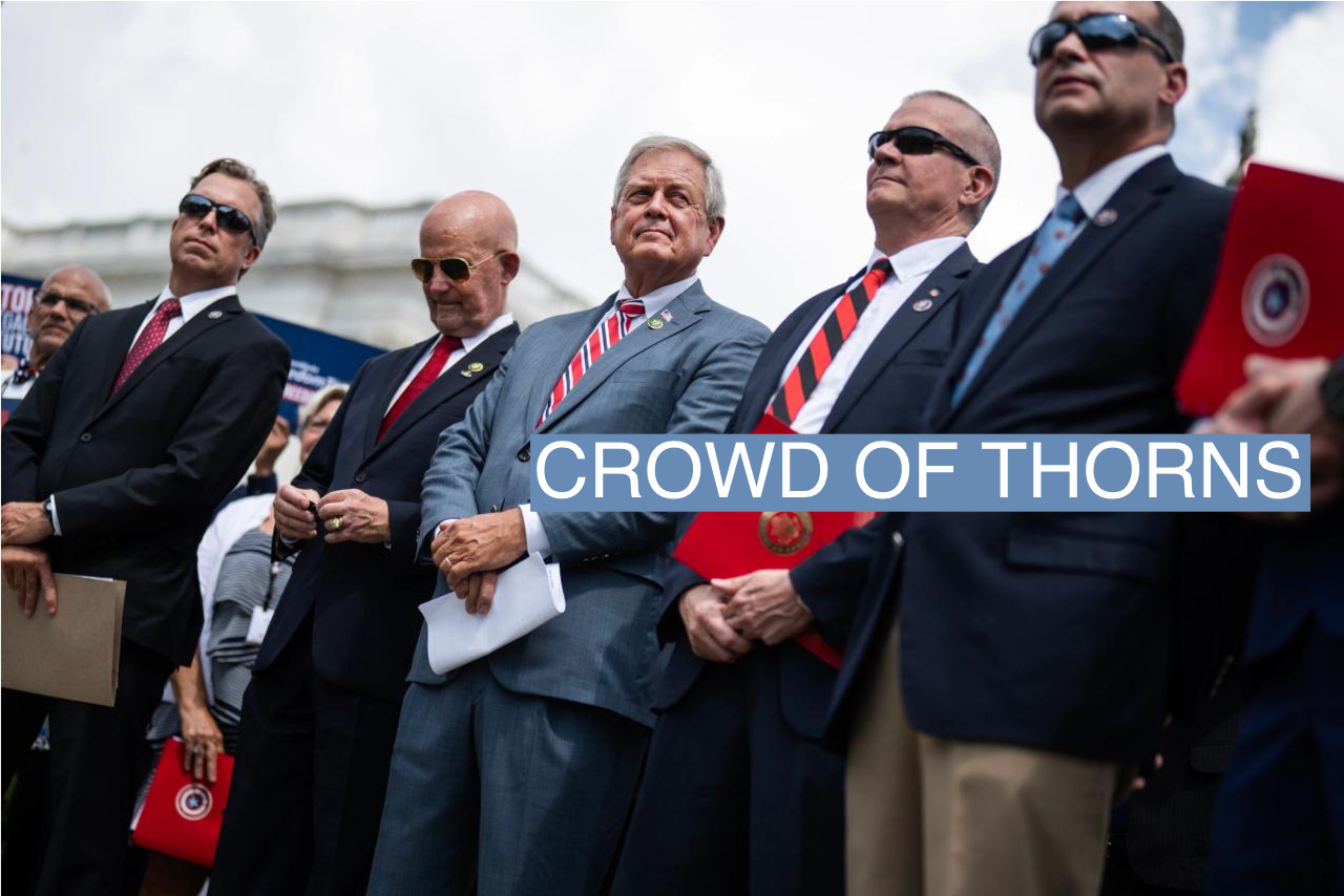House Republicans had hoped to start passing spending bills for next year’s budget before leaving Washington this week. On Tuesday, however, a small group of hardline conservatives threatened to scramble those plans, appearing together at a press conference where they all but called for a government shutdown later this year if their demands for deeper funding cuts aren’t met.