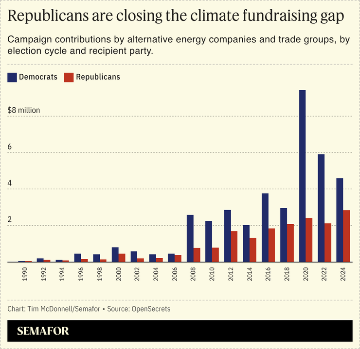 But since then, the industry’s financial enthusiasm for Democrats has waned, and Republicans have closed the gap. Direct support for Trump himself is still rare in the industry, but there are a growing number of enterprise-minded Republican congressional candidates that are drawing clean-energy support. Two of the top five donor groups so far this year have given more to Republicans than to Democrats. If Harris wins the White House but loses Congress, more ambitious parts of her climate agenda would be hamstrung, even if more Republican members are ostensibly pro-clean energy. Putting Harris up top could jolt donors at all levels, said Jon Powers, a former Obama administration climate official who is now president and co-founder of the renewable energy developer CleanCapital and a prominent Democratic fundraiser who sits on the board of the Environmental Defense Fund’s political arm.