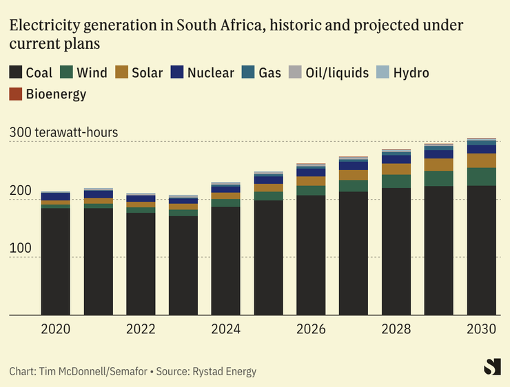In the big picture of South Africa’s climate targets, all this new solar is still just a drop in the bucket. By 2030, the country is aiming to get 41% of its power from renewables, up from 11% today. But because total consumption is rising quickly, and because Eskom is still constructing massive new coal-fired power plants, the share from renewables will likely fall short of the 2030 target, according to Rystad. “The coal and gas South Africa is building will nullify a lot of the renewable energy growth,” Rystad analyst Nivedh Thaikoottathil said.