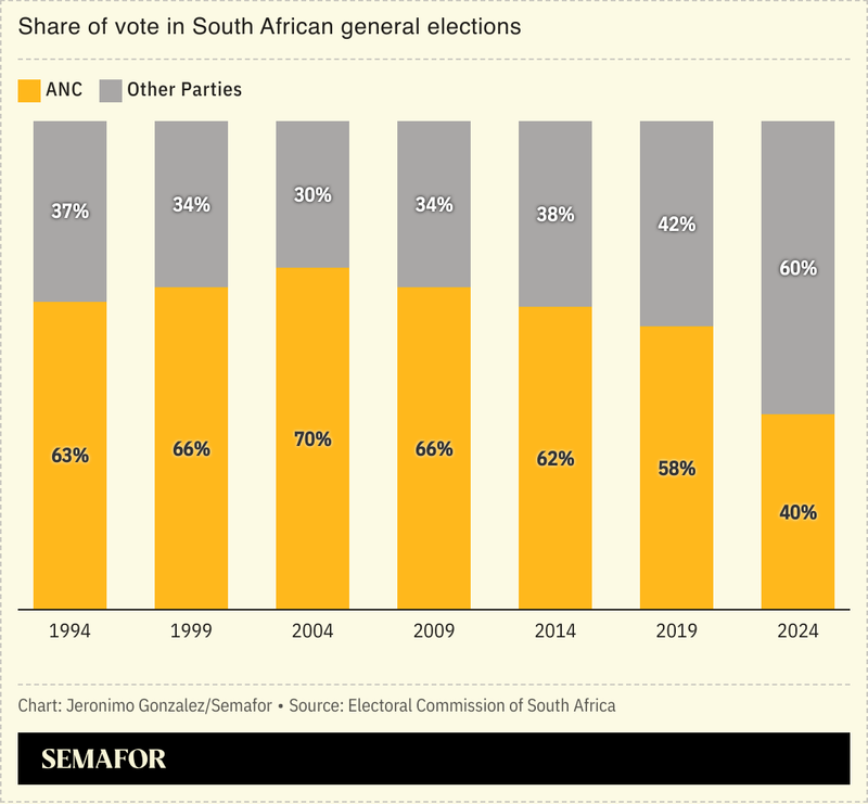 The ANC won 40% of the vote in June’s election, down from almost 60% in 2019, forcing it into a broad coalition government comprising cabinet members from seven parties.