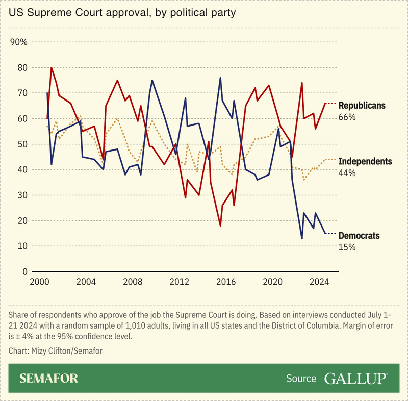 Currently, 43% of American adults approve of the job the court is doing, while 52% disapprove. The opinions of the conservative-leaning court vary widely between parties, with 66% of Republicans approving, 44% of independents, and 15% of Democrats.