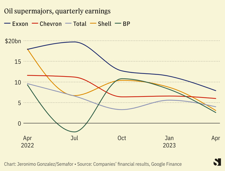 Western oil majors reported drops in second-quarter earnings of about 50% compared to the same period last year, when Russia’s invasion of Ukraine sent oil and gas prices soaring and pushed profits to record levels. Even with profits remaining high by historical standards, the sharp drop could reshape the companies’ renewable energy production plans.