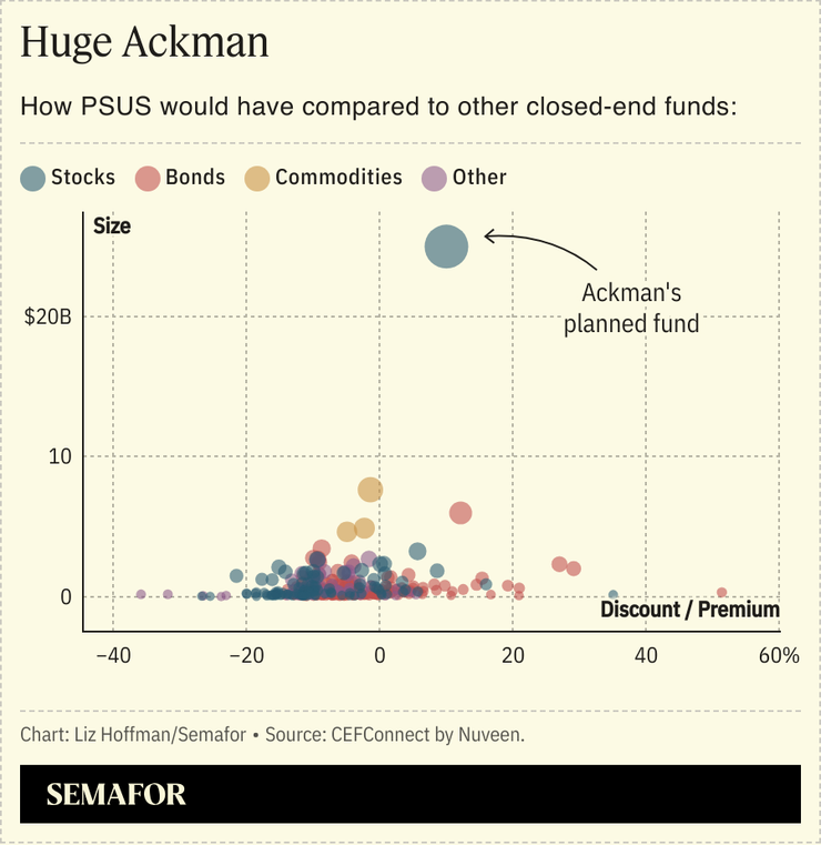 But Ackman’s worst outcomes have always come from his cleverest ideas (tontine, SPARC, hostile tender offers) and his tendency to blend investment theses — many of them perfectly good — with personal missions. The launch of PSUS had both: an obscure investment vehicle, 40 times bigger than the average such fund, built on his newly acquired alt-right fame, and fed by an amen corner of online fans.