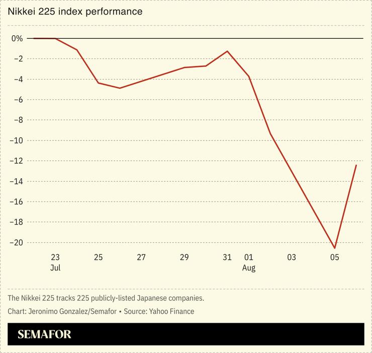 Monday’s declines show just how interconnected and fragile the global economy is, a Japan-based professor wrote on UnHerd. That disappointing economic news in the US impacted Japan so strongly, and that moves by the Japanese central bank ricocheted to the West just as quickly, could be a harbinger of future difficulty if the long-feared US recession ever arrives. “If merely worrying, rather than disastrous, economic news from the US can spark a conflagration in Japan, what will happen to global markets, currencies, and even the Western security alliance, if something truly calamitous transpires — such as a dollar collapse?” he wrote.