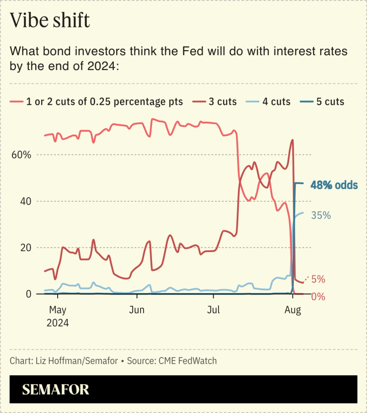 Just three weeks ago, investors were putting 70% odds that the Fed would make one or two cuts of 0.25 percentage points by year-end. Today that bet has no takers, and nearly half think there will be five such cuts (or fewer, bigger ones).
