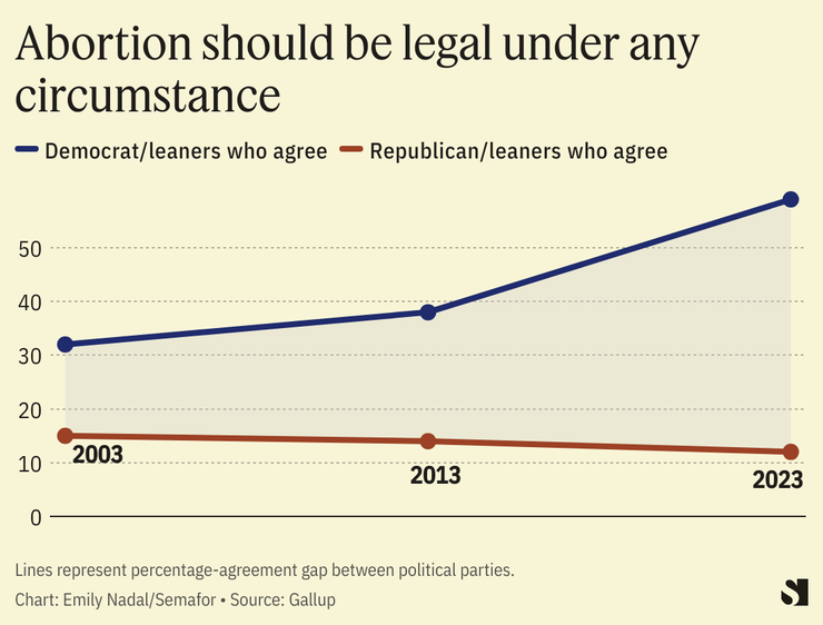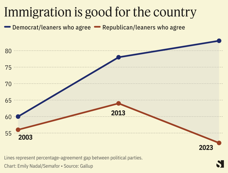 Some other notable areas where polarization has increased: Abortion, which Democrats are now far more supportive of keeping legal in any circumstances, and immigration, where Democrats and Republicans have moved in opposite directions on whether the U.S. should decrease the number of immigrants it admits and the overall benefit they provide to the country. The parties are still moving in opposite directions on climate change as well, though it hasn’t stopped a red state boom in renewable energy and electric vehicle production.