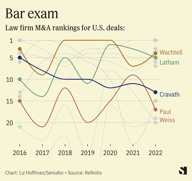 More broadly, the boutique model, while becoming more popular for bankers, has waned for lawyers. Kirkland has more than 3,000 lawyers; Skadden, more than 1600. Of 15 leading M&A shops in 2022, only two have fewer than 100 partners: Wachtell Lipton and Cravath. There may only be room for one.