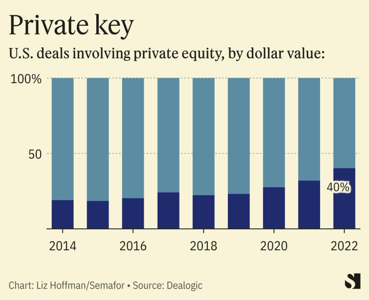 Pitched takeover battles between name-brand public companies drive headlines, but the money is increasingly in serving private firms. Private equity accounted for less than 10% of U.S. deals in the 1990s, according to PWC. Last year, that figure was 40%. And more than 80% of medium-sized buyouts last year were financed by private credit firms, according to McKinsey.