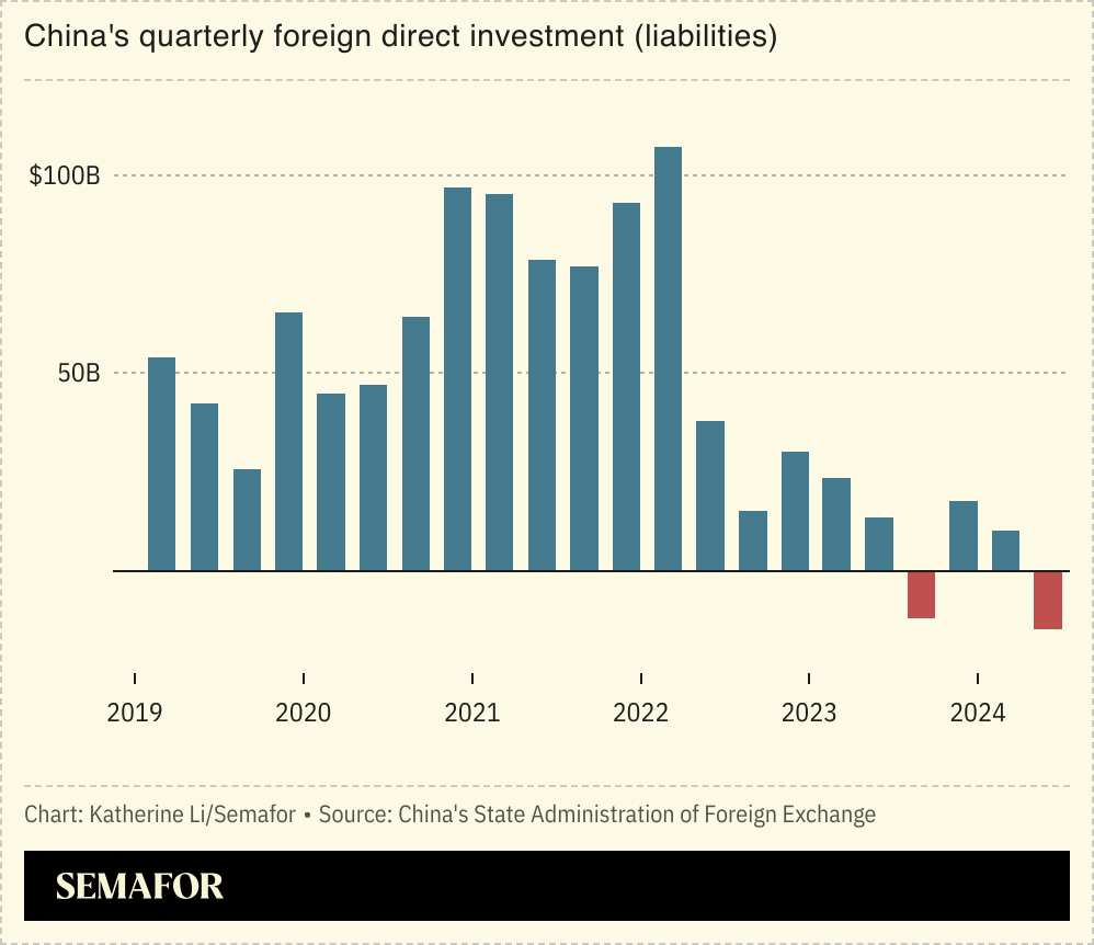 China lost a record $15 billion of foreign investment last quarter, state data showed. If the decline continues through 2024, it would be the first annual net outflow of cash since at least 1990, Bloomberg reported, reflecting investors’ “deep pessimism” about China’s slowing economy as foreign firms scramble to reduce their exposure in light of Beijing’s growing hostility with the West.
