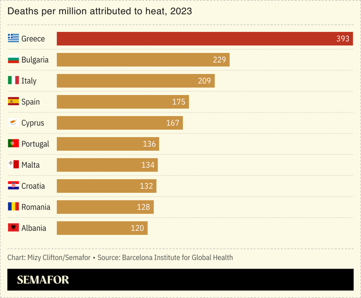 Greece experienced its hottest June and July since records began this year, and there’s evidence that heat stress may be increasing mortality, particularly in southern Europe. More than 47,000 people died in Europe in 2023 as a result of heat, according to a new study published in Nature Medicine. It would have been far more, the researchers say, without climate adaptations. Public health initiatives and individual changes — like installing AC, for example — have cut heat-related deaths in recent years, but “inherent limits in human physiology and societal structure are likely to set a bound to the potential for further adaptation in the future,” one of the researchers warned.