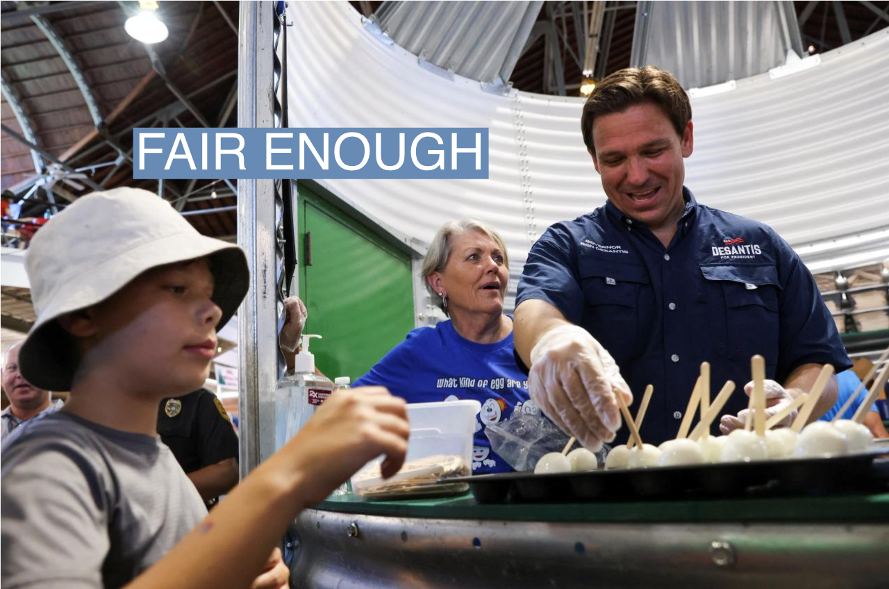 2. Ron DeSantis isn’t dead yet. Crowdsmanship aside, DeSantis had a nearly ideal fair day — gaffe-free, with plenty of well-wishers and photo ops. He was the only candidate protested at Reynolds’s candidate sit-downs, a disruption by the left-wing group “Bitches Get Stuff Done” that didn’t derail the event, but underlined how progressives feared him, which is part of his pitch. (Heather Ryan, the group’s founder, told me that DeSantis was “the most active fascist in the Republican Party besides Trump.“)