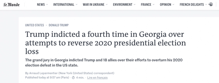 Trump indicted a fourth time in Georgia over attempts to reverse 2020 presidential election loss — Le Monde
