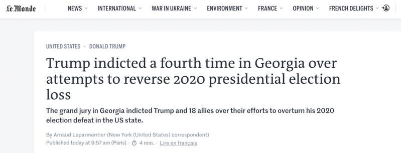 International media outlets were quick to respond to the news that former U.S. President Donald Trump has been indicted for a fourth time.