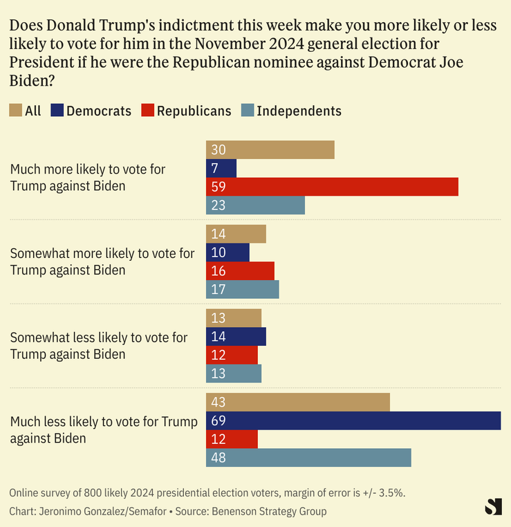 A new poll shared exclusively with Semafor finds that Donald Trump’s legal troubles could prove fatal in a general election.