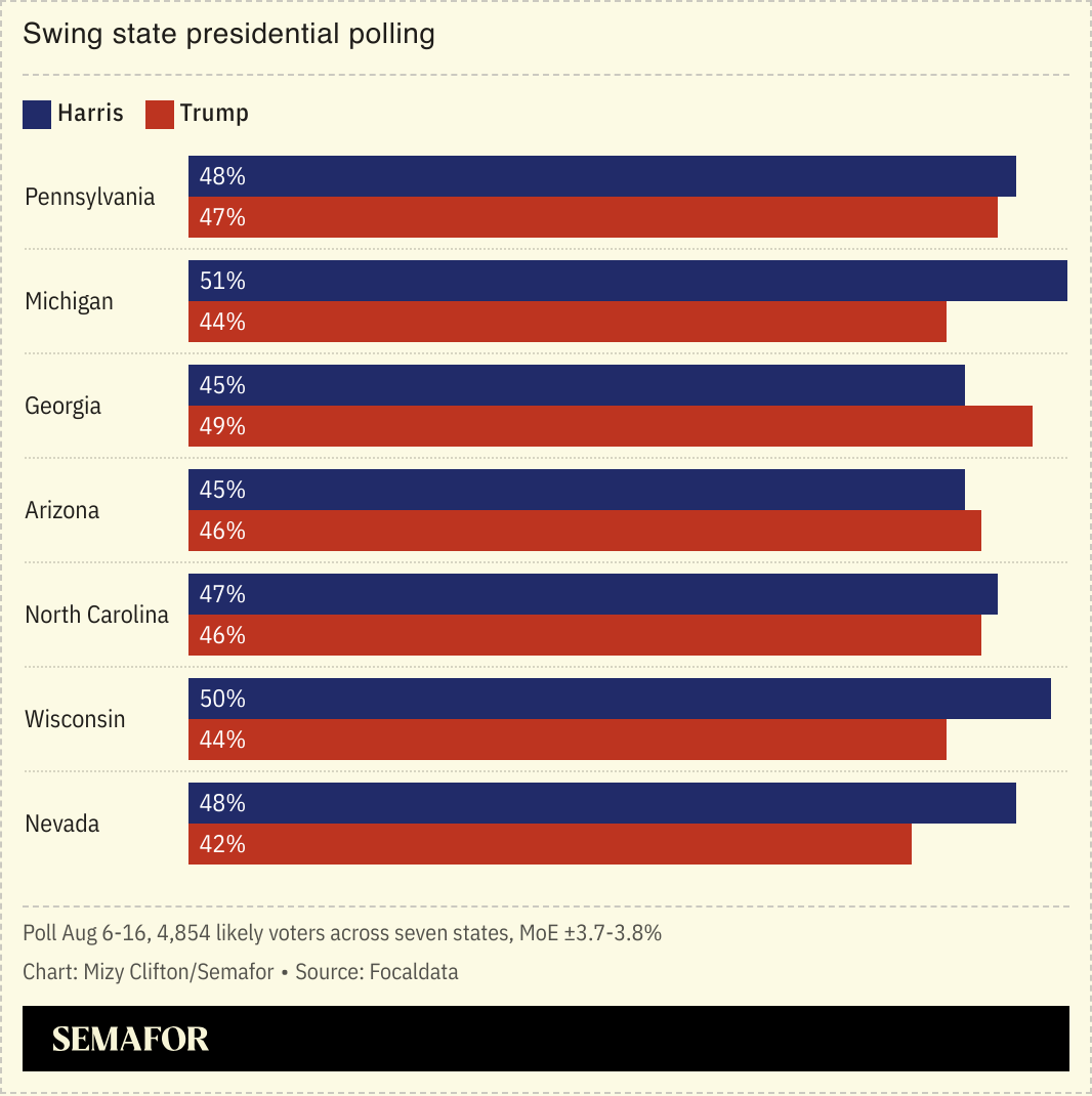 Vice President Kamala Harris leads former President Donald Trump in five of seven battleground states, according to new polling shared first with Semafor that shows a tight presidential election.