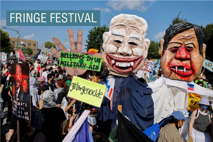 As they milled around Union Park, the launch point for Monday’s anti-DNC march, protesters and reporters walked closer to identify the third head. It belonged to Philippines President Ferdinand “Bongbong” Marcos, face stained with blood, hand gripping “US & Israeli-Made Bombs.” Anakbayan-USA, the left-wing Filipino youth movement, had first marched with it to raise awareness of last month’s $500 million military aid package to the Marcos government.