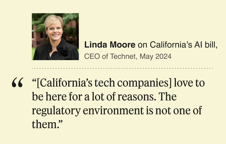 One of the tech industry’s top advocates in D.C., Linda Moore was in San Francisco and talked about the California’s AI bill.