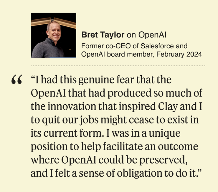 I asked Bret Taylor about stepping into a director role at OpenAI in the wake of the controversy, and whether it would be a distraction at his new startup. Taylor joked that his reputation might be like Harvey Keitel’s character in Pulp Fiction, who’s hired to clean up messes.