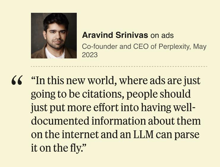 Before Perplexity was one of the most prominent AI startups, its co-founder and CEO, Aravind Srinivas, laid out his vision for the company that eschewed ads. Today, Perplexity embraces ads.