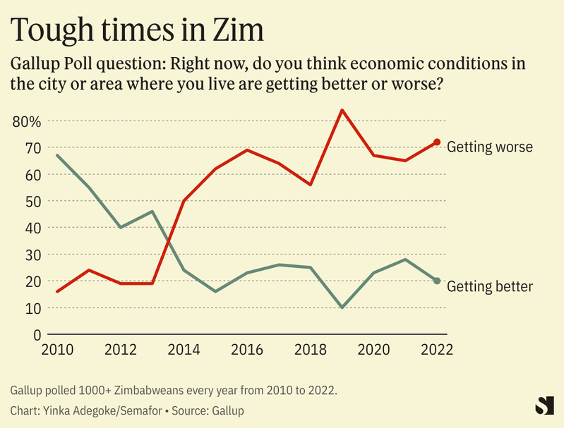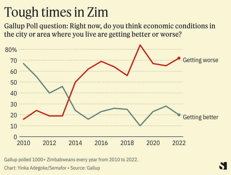 A Gallup survey has highlighted the waning confidence of Zimbabwe’s citizens in employment and economic prospects. About 62% of Zimbabweans surveyed said they “feel their standard of living is getting worse” and 72% said the current period “is a bad time to find a job.”