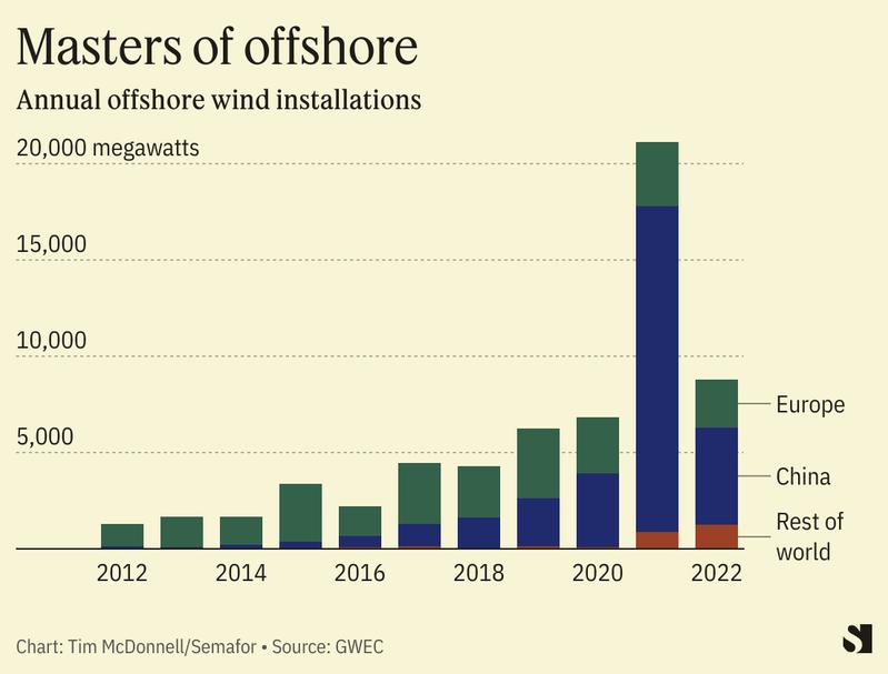 Europe, which was long the global epicenter for offshore wind, is now in second place to Asia after a remarkable surge in installations in China, according to a report this week from the Global Wind Energy Council. As more of the upstream supply chain for offshore wind hardware shifts to China, the report warned, “restrictive trade policies proposed by the EU and the U.S. are almost certain to create bottlenecks.”