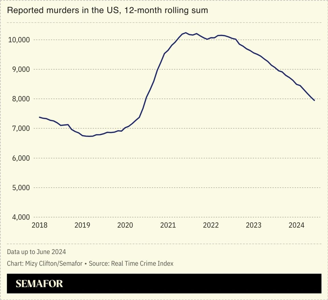 “Crime data is traditionally slow, which leads to misperceptions about trends,” Jeff Asher, a co-founder of AH Datalytics who is overseeing the project, told Semafor. “I wanted to build a system that leverages vast quantities of available data on crime that allows anyone to see the numbers and trends in novel ways without having to wait for final estimates to be published months later.”
