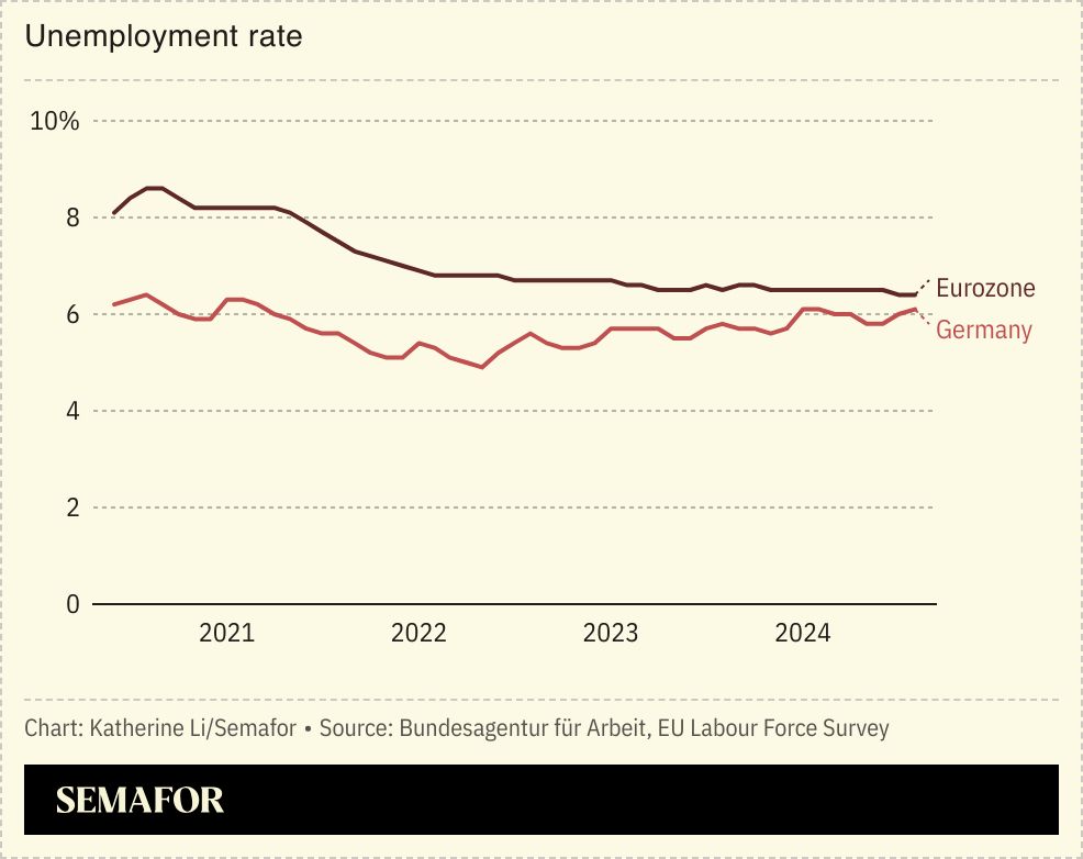 High-skilled roles are in decline. Employee protection rules make it hard to lay off workers, so it can take a long time for underlying problems to show in employment data. One analyst told the Financial Times that “job cutting among German blue-chips [is at] the highest level since the financial crisis.” Another said the labor market faced “death by a thousand cuts.”