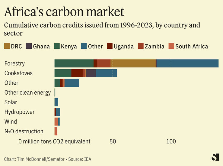 Carbon credits could fill this gap and lower the high cost of capital for African clean energy projects by giving U.S. and European companies, and even governments, an added incentive to put their money into African climate projects: the ability to write down their own emissions. Africa-based carbon credits — predominantly from forest conservation projects — are already routinely sold to Western airlines, energy companies, and other big emitters, although they account for only about 11% of credits on the market globally, according to the International Energy Agency.