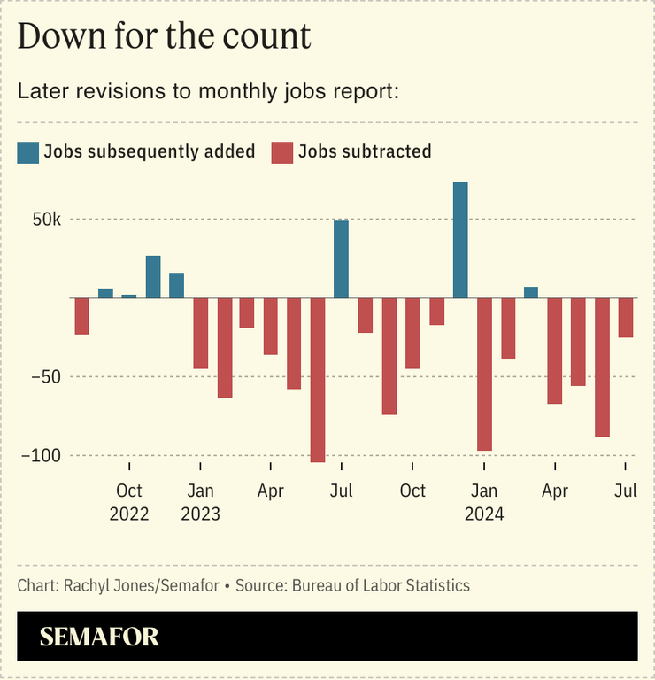 In the report, the Labor Department revised July’s hiring data down from the previously reported 114,000 new jobs to 89,000. It also revised June’s figure down from 179,000 new jobs to 118,000. The movements align with other revisions in the last year but indicate the jobs market is consistently worse than the BLS’s initial data.