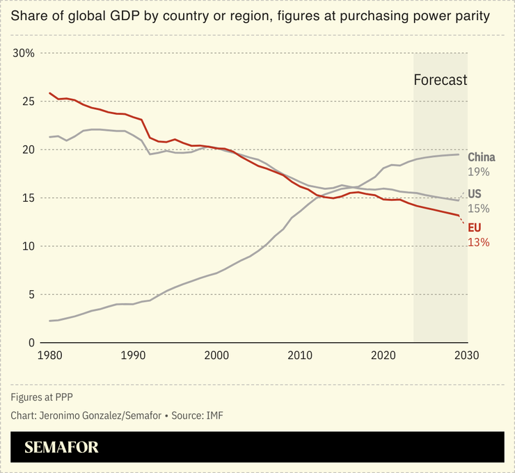 The vast amount of paperwork required to operate in Europe has an outsized effect on small businesses, the Financial Times wrote: The 2019 “Green Deal” climate law alone “has spawned reams of legislation that businesses across the EU are struggling to implement, or even understand.” The textiles industry, meanwhile, is subject to 16 new laws requiring it to collect various forms of data — significantly increasing the paperwork and burden on companies, particularly small ones. Even the length of Mario Draghi’s report itself inspired chatter about the EU’s penchant for administration: “You can say what you want about European competitiveness, but there is absolutely no disputing the fact that the EU leads the world in 400-page reports,” a popular EU-focused satire account posted on X.