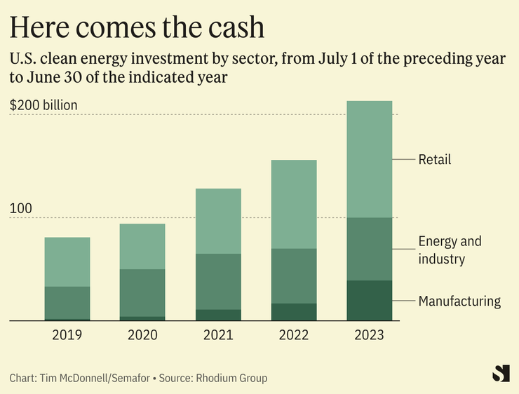 The latest evidence is a report today from the Rhodium Group think tank and MIT on U.S. clean energy investment trends. $213 billion was invested by businesses and retail consumers in the year to June, the report found, in manufacturing and installing clean energy hardware. That’s 37% more than the previous 12-month period, and more than the annual GDP of 18 U.S. states, making clean energy one of the country’s biggest industries.