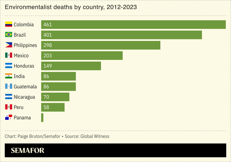 The findings are in stark opposition to the promises of Colombian President Gustavo Petro, who took office in 2022 pledging to protect local communities from environmental injustice and to end the country’s 60-year conflict against militant groups. Organized crime accounted for a suspected half of land defender murders in Colombia last year, according to the report. A government spokesperson described the situation as “dishonorable.”