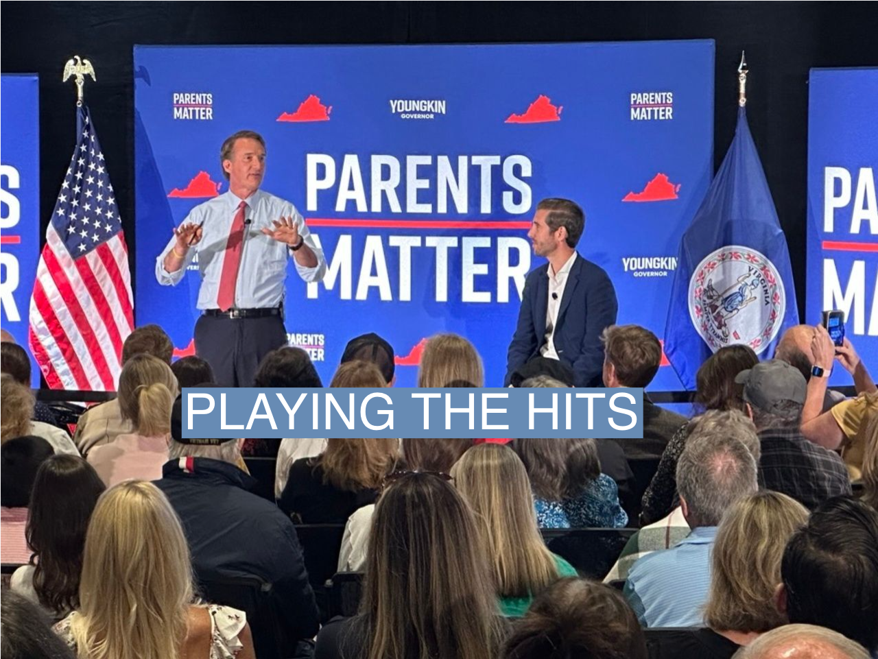 - In the Dispatch, David M. Drucker and Audrey Fahlberg write about Youngkin “playing the hits” on education and “focusing on an issue that carried him to an unlikely victory two years ago.”