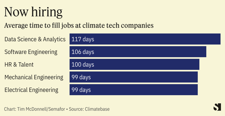 Companies that are scaling up are also struggling to fill open positions, according to data from climate jobs platform Climatebase.