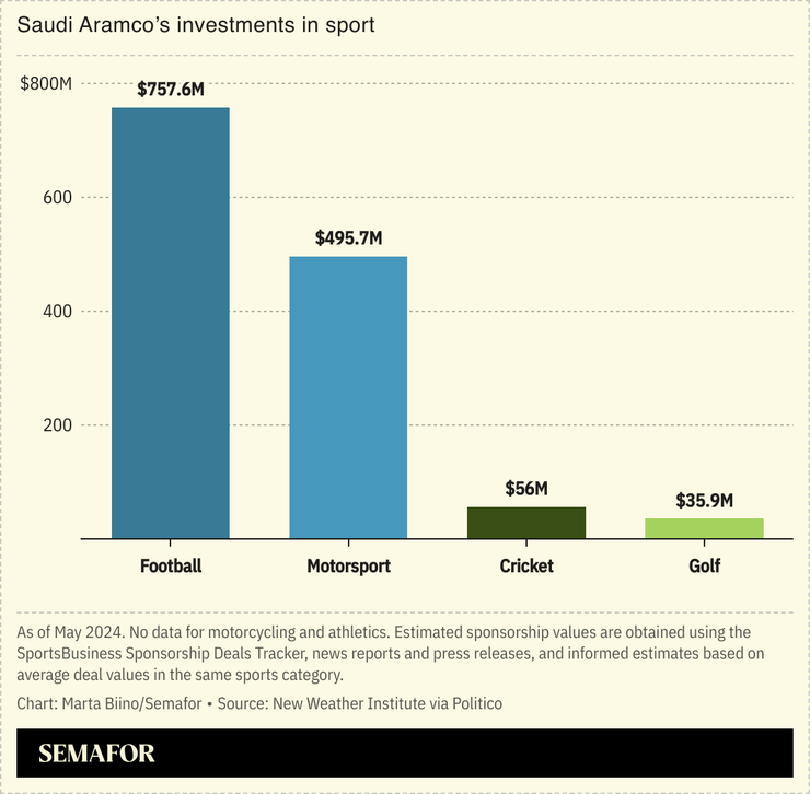 The single biggest source of money identified was Aramco, Saudi Arabia’s state oil company, which has poured an estimated $1.3 billion into sponsorship deals, primarily in soccer and motorsports. But almost all major sports have some sponsorship coming from fossil fuel companies, the report found, with rugby and golf also ranking high among the disciplines with the most active deals.