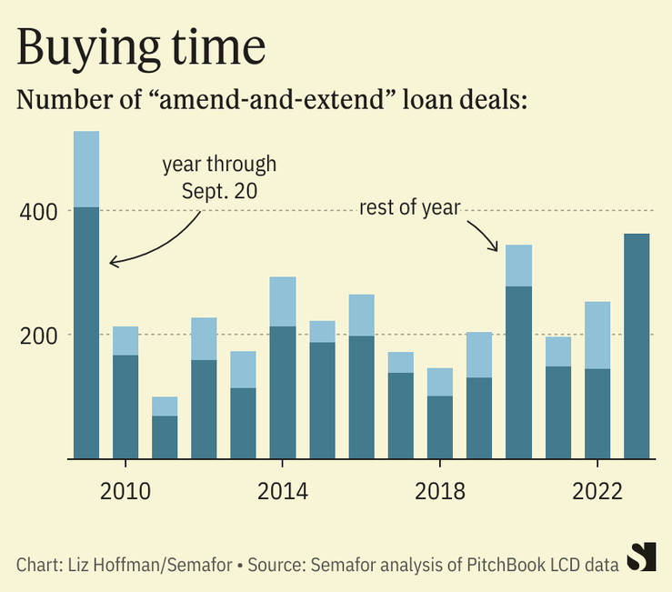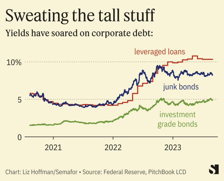 This time around, the obvious problem is interest rates. Corporate loans are mostly floating-rate, so borrowers’ payments have gone up 11 times since the Federal Reserve began its hikes last year. Yesterday, the central bank projected rates would stay higher for longer.