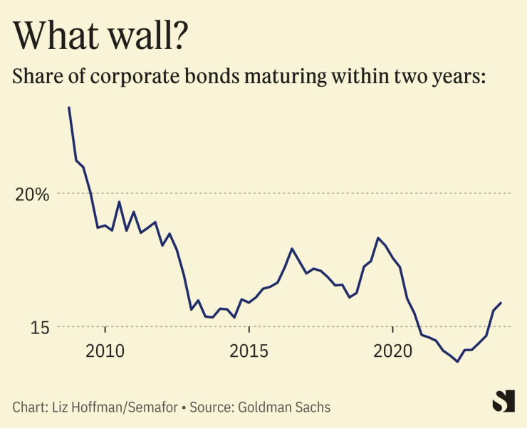 Companies issued so much debt in the free-money era that relatively little is coming due anytime soon. The biggest chunk doesn’t mature until 2028, at which point the Fed’s own governors expect the baseline interest rate to be about half of what it is today.