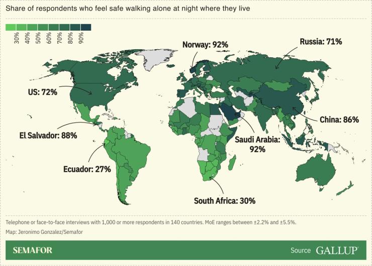 Progress has not been uniform: People in former Soviet states feel much safer than they did 20 years ago, but those in sub-Saharan Africa and Latin America noted a decline. Ecuador in particular, once relatively peaceful, is now the country where people feel least safe. On the flip side, El Salvador, ranked second last in Gallup’s 2016 poll, is tied for eighth following a controversial crackdown on gang violence.