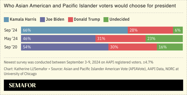 More than two thirds of AAPI voters surveyed plan to vote for Harris, up from 46% who planned to vote for Joe Biden before he bowed out of the race, the poll by APIAVote found. Most have a favorable opinion of both her and Walz.