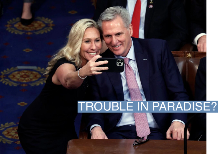 After getting off to a rocky start with the Republican leader, Greene shocked much of Washington by cozying up with McCarthy to become one of his most outspoken allies during his battle for the speakership — even posing with him for a victory selfie on the House floor. (“I will never leave that woman,” McCarthy reportedly told a friend. “I will always take care of her.“)