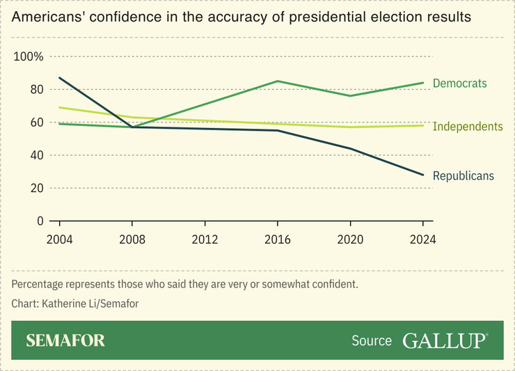 Some 43% of Americans are not confident their votes for president will be counted accurately, and there is a record partisan gap when it comes to trusting the process. A new Gallup poll showed that Democrats’ confidence in election integrity increased by eight points between 2020 and 2024, while Republicans’ fell by 16 points.