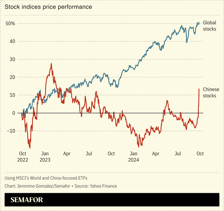 The rally spread across the world, with shares of luxury giant LVMH — which is increasingly reliant on Chinese consumers — rising more than 15% yesterday. And IKEA announced its biggest-ever investment in the country shortly after the stimulus was unveiled.